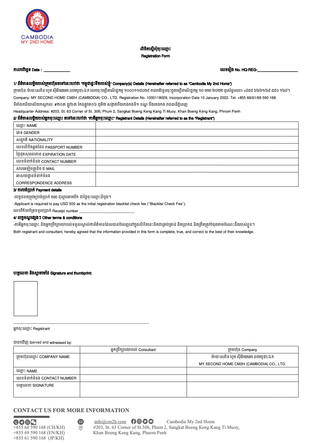 “Cambodia My 2nd Home” is the major initiative launched by My Second Home CM2H (Cambodia) Co., Ltd. with MOI with an aim to introduce this beautiful country to the world. We allow people from around the world to sign up for CM2H membership for a broad range of services and consultancy including immigration, business, education, families, etc. At the same time, we will give back and contribute to society unparalleled through a Charity Association, the Khmer Home Charity Association (KHCA).